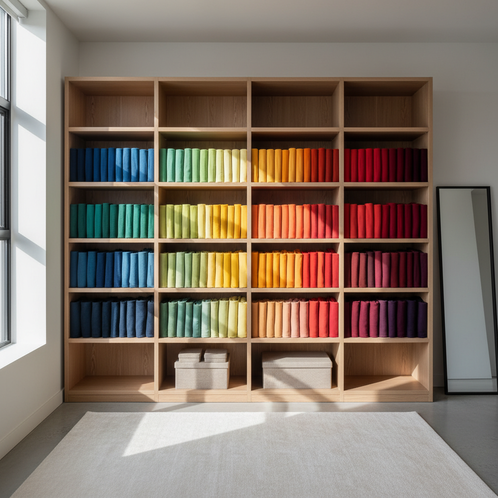 - Armazenamento Vertical: Técnica de guardar roupas em pé, como livros em uma estante, em vez de empilhadas.